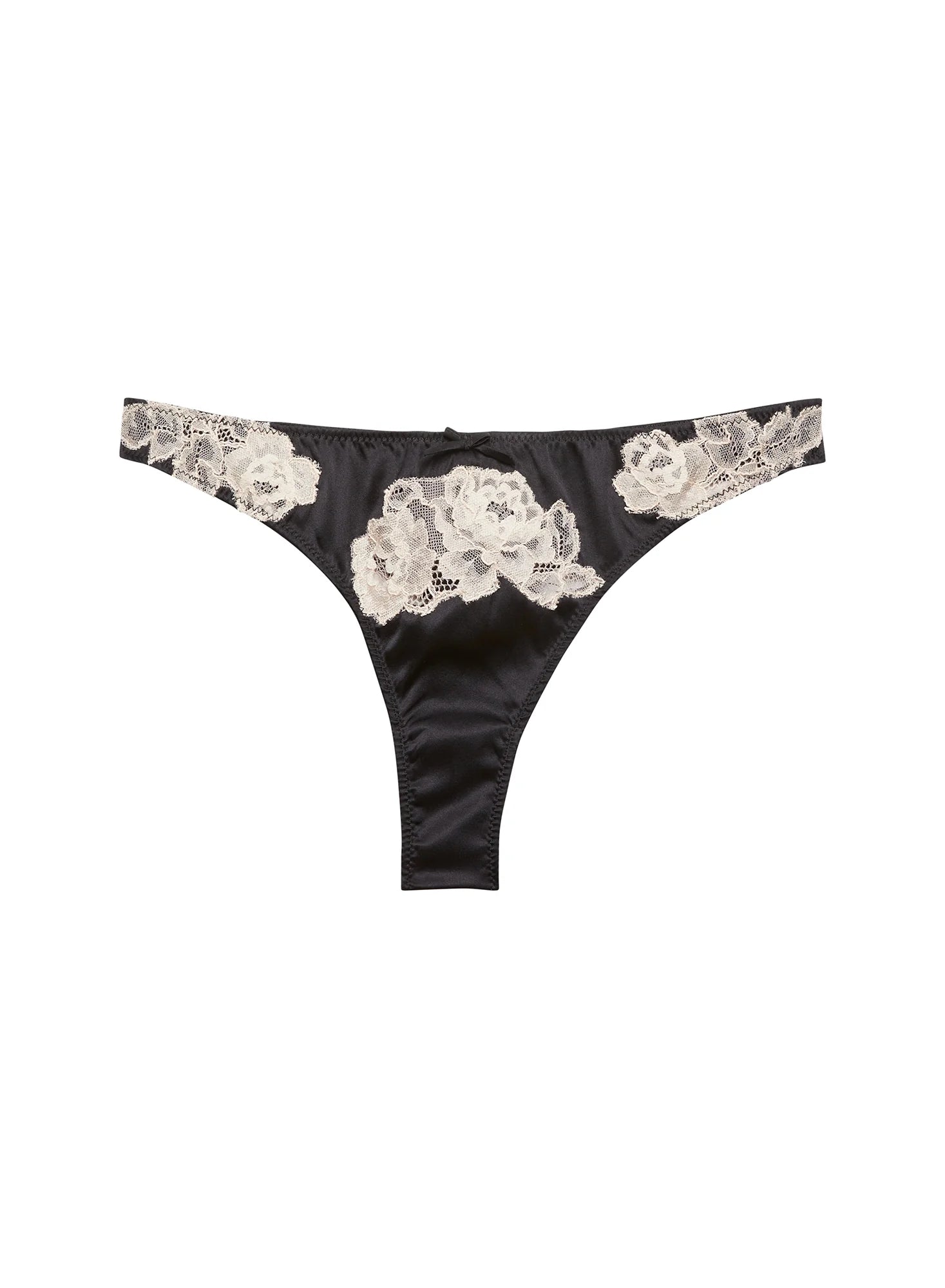 The Juliet Lace Thong, cut from luxe silk charmeuse with lace appliqué details. Features front bow and back keyhole detail. Complete this stunning set with the matching Juliet Lace Demi Bra & Garter Belt.